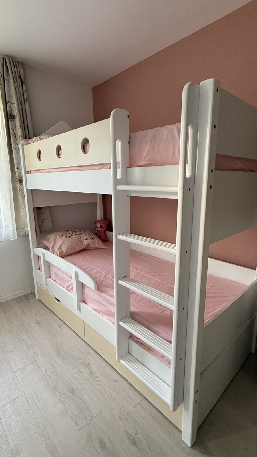 Camera este acum complet gata, iar patul este minunat! Fetița noastră doarme deja singură în el de o lună și este foarte fericită!