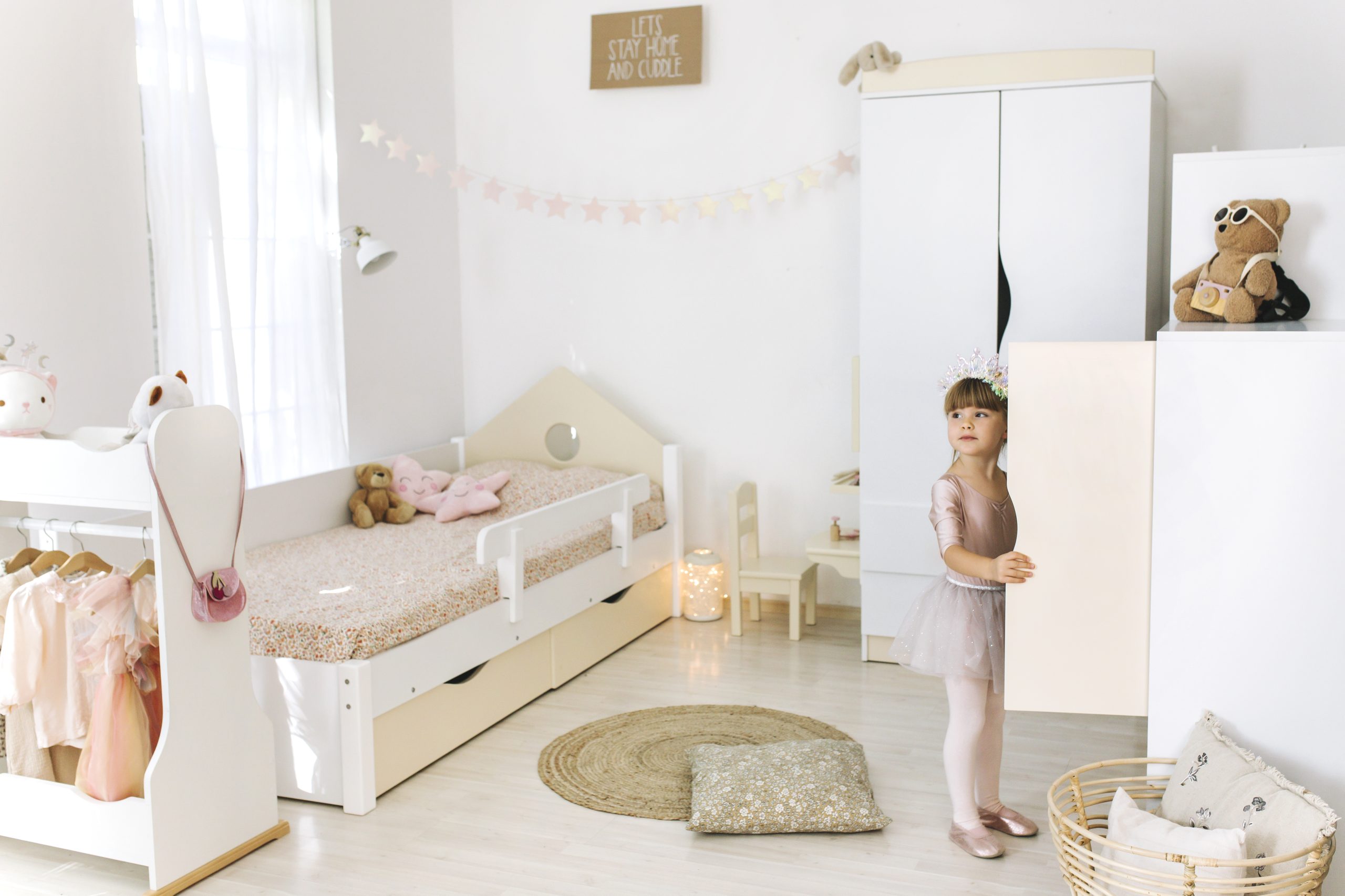 Un aspect delicat pentru micile prințese – pat, dulap, măsuță de toaletă, module de depozitare și dulap deschis tip Montessori.