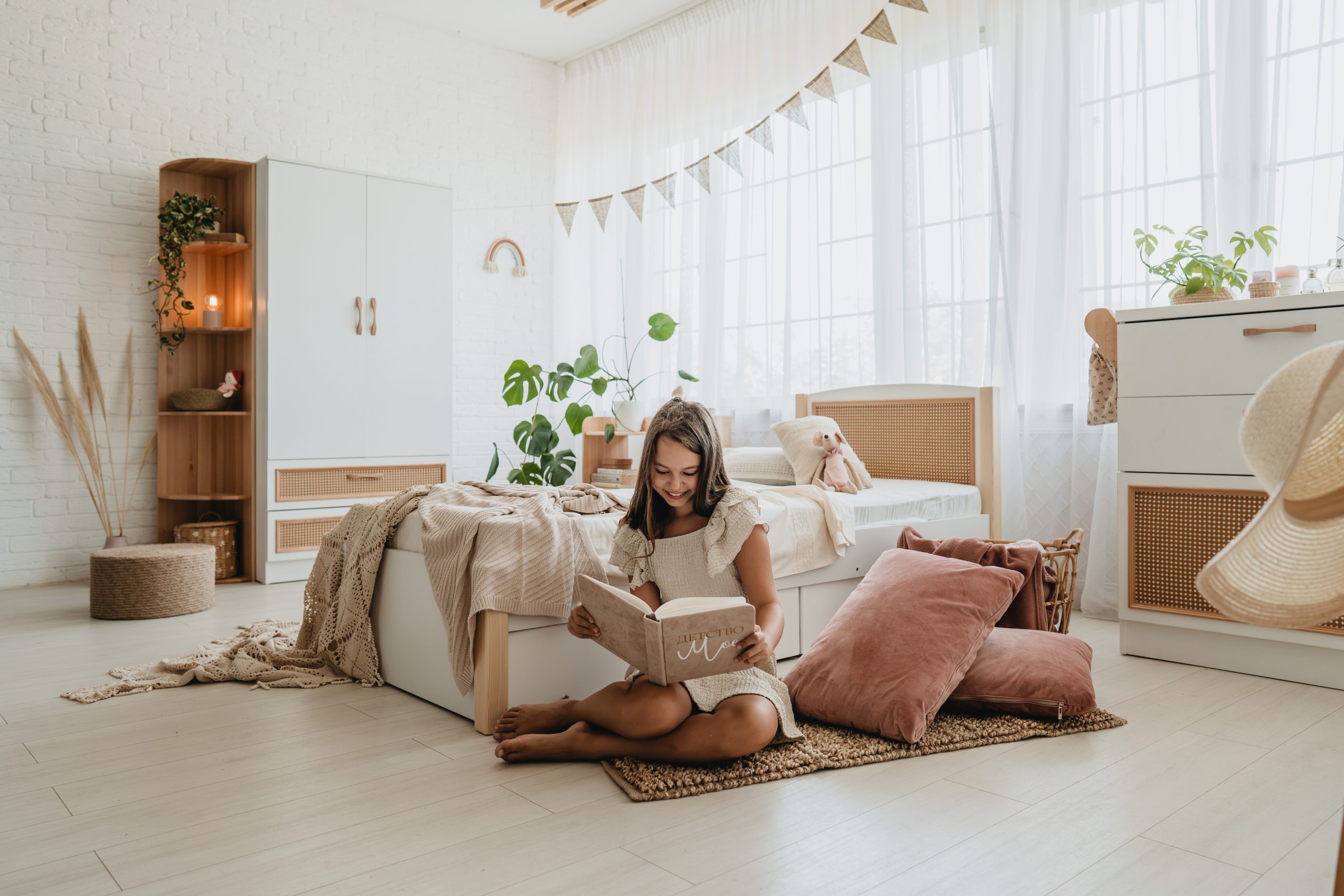 Materiale naturale, culori pământii și confort pentru copiii mai mari. Perne, covoare, coșuri și plante.