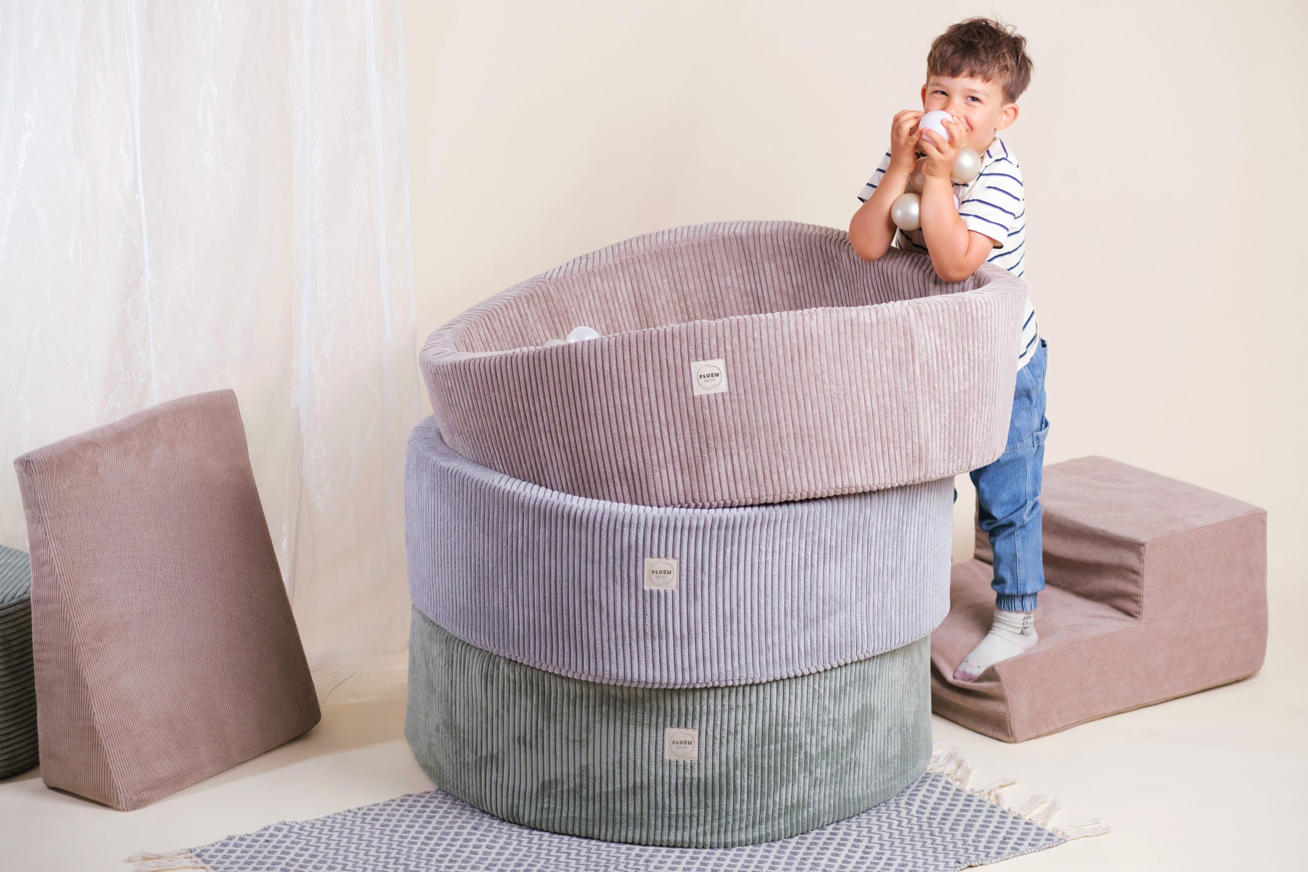 Moale, sigur și elegant – piscina noastră rotundă din catifea reiată, cu 200 de bile colorate, este creată special pentru copii cu vârste între 1,5 și 3 ani.